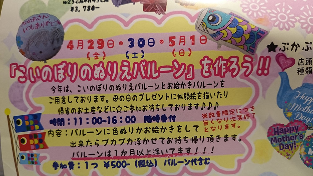 『こいのぼりのぬりえバルーンを作ろう』開催中です^^